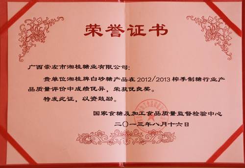 近日獲悉,湘桂集團(tuán)下屬子公司廣西崇左市湘桂糖業(yè)有限公司(簡稱崇左湘桂公司)產(chǎn)品“湘桂”牌一級(jí)白砂糖榮獲國家食糖及加工食品質(zhì)量監(jiān)督檢驗(yàn)中心頒發(fā)的“2012/2013榨季制糖行業(yè)產(chǎn)品質(zhì)量優(yōu)良獎(jiǎng)”。