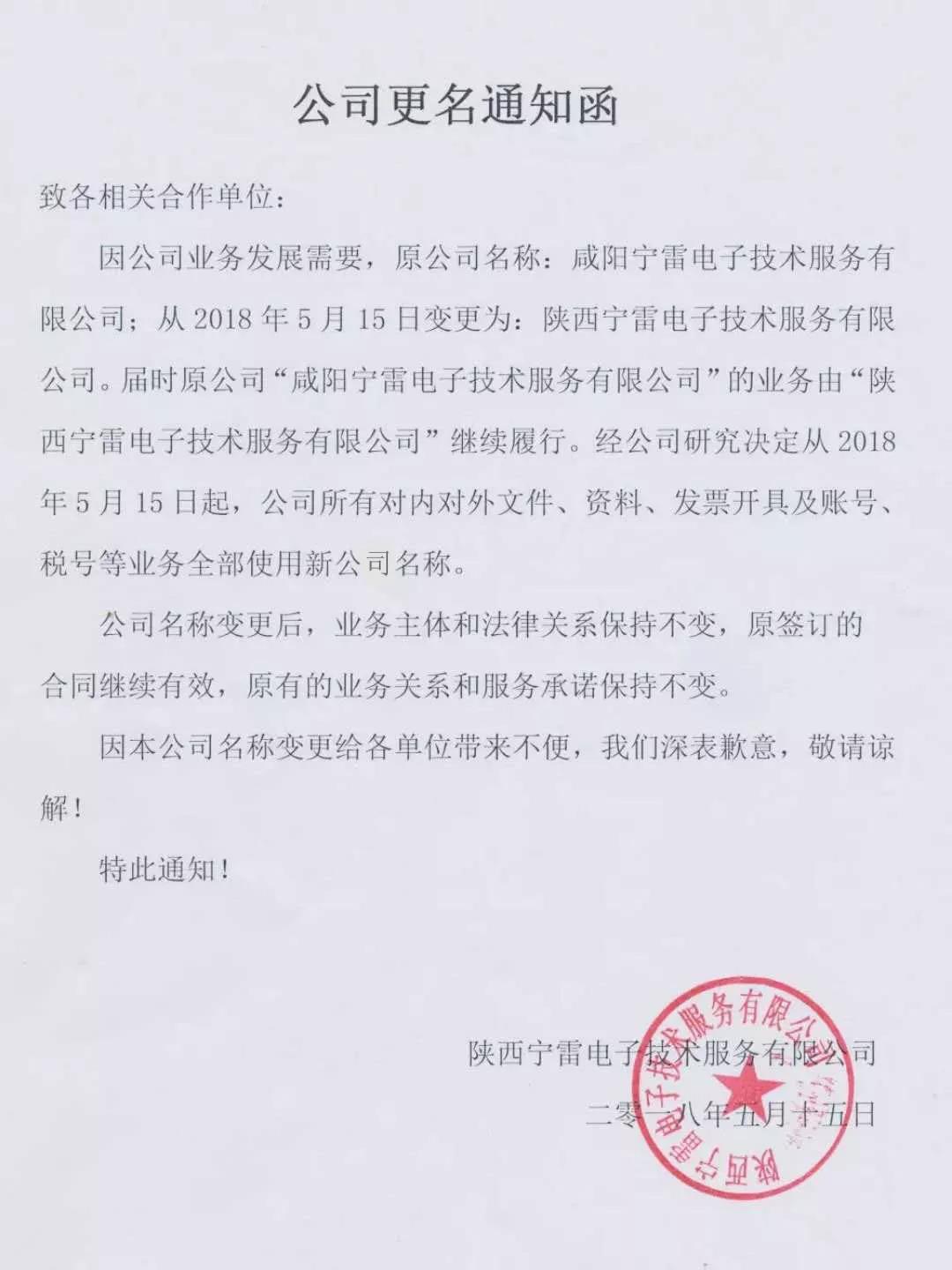 對(duì)的沒(méi)錯(cuò)!首先感謝各位的支持,正是有了各位的相助,我司的業(yè)務(wù)量得以穩(wěn)步提升。咸陽(yáng)寧雷電子技術(shù)服務(wù)有限公司自即日起正式更名為陜西寧雷電子技術(shù)服務(wù)有限公司,文件如下: