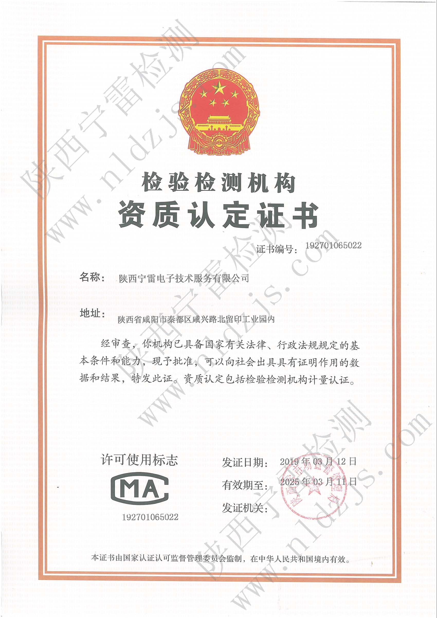 陜西寧雷檢測喜獲國家CMA證書